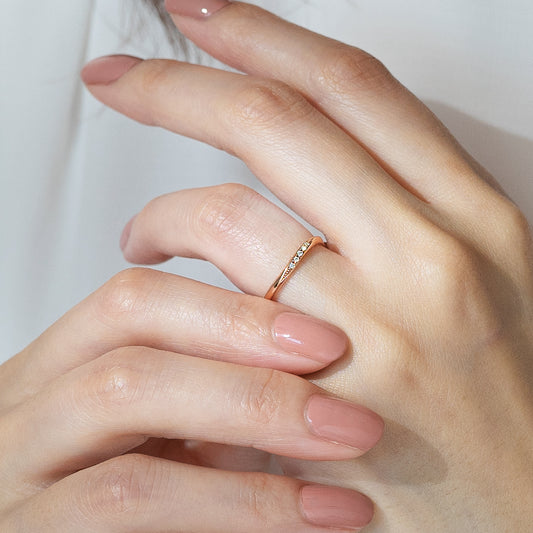 緩やかなウェーブラインのダイヤモンドリング。繊細な5石のメレダイヤがきらきらと輝きます。